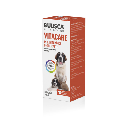 BUUSCA® VITACARE é um alimento composto complementar para cães, com aminoácidos, vitaminas e minerais, especialmente desenvolvido para o equilíbrio nutricional e vitalidade do seu animal de companhia.